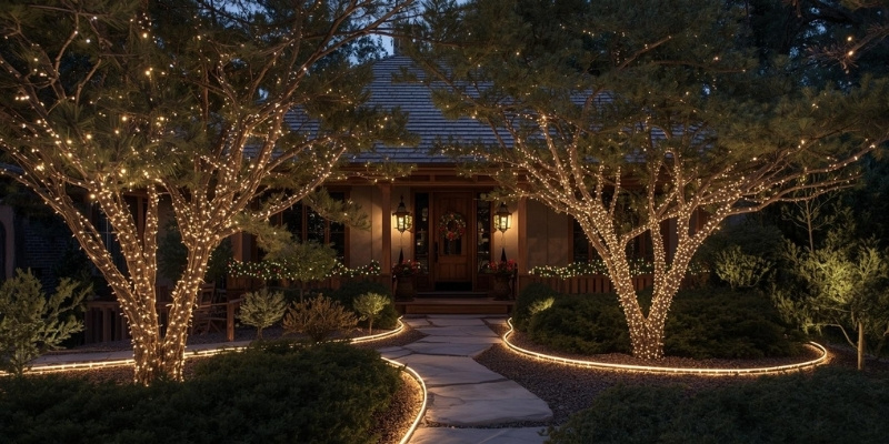 Use warm white lighting paired with natural elements like pine, wood accents, and greenery. Wrap trees loosely with warm string lights and outline paths gently with rope lighting.