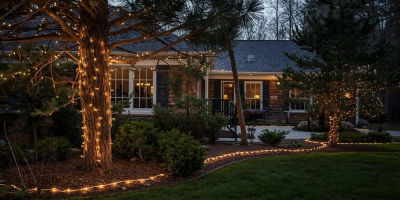 Use warm white rope lights around windows and doors. Add soft string lights to small trees, bushes, and porch seating areas. Keep lighting close to the house rather than spreading it across the yard.